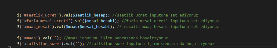 $(‘#maas_mesai’).val($maas+$mesai_hesabi); // mesaili maaş hesabı inputuna set ediyoruz