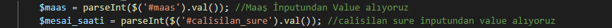$mesai_saati = parseInt($(‘#calisilan_sure’).val()); //calisilan sure inputundan value alıyoruz