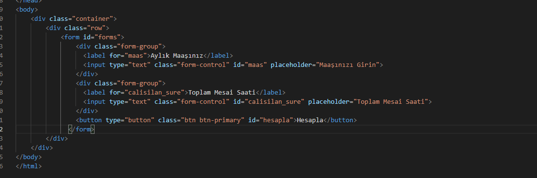 Aylık maaşı aldığımız inputumuzu oluşturduk.O ay ne kadar mesai yapıldığını aldığımız inputumuzu oluşturduk ve bir tane da buton oluşturduk.Bu konuda dikkat edilmesi gereken bir nokta var.İlk buton eklendiğinde type submit olarak default oluşur eğer type submit olursa her işlem sonrasında bütün inputlar boşaltılır ve bununla uğraşırken sizde sıkıntıya girersiniz.En azından ben girmiştim ilk başladığımda.