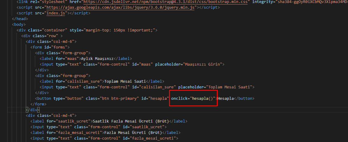 Öncelikle bir function oluşturuyoruz ismi hesapla olsun ve son html ile işimiz olan onclick işlemini butonumuza veriyoruz